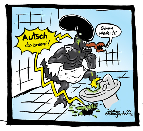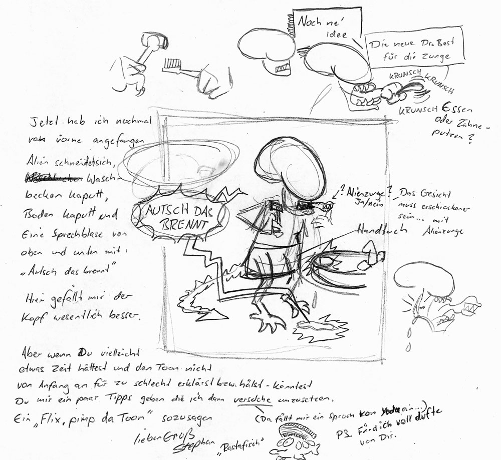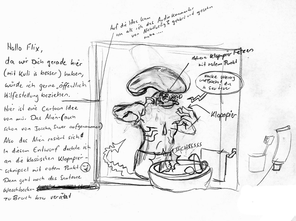 Den Alien-Cartoon würde ich ganz einfach machen: Er schneidet sich, es tropft durchs Waschbecken auf den eigenen Fuss und der klaine Kopf brüllt einfach wehleidig: "Oh Shit!". Ende.