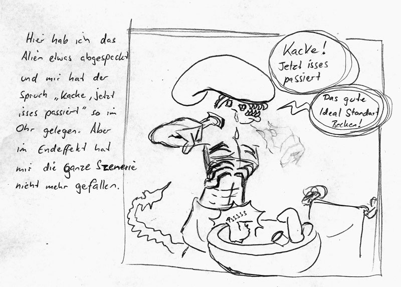 Ich fand den Gag, dass ein und dieselbe Sprechblase mit "Autsch das brennt" vom Alien und von der Etage darunter kommt, eigentlich zu gut zum wegschmeissen…
