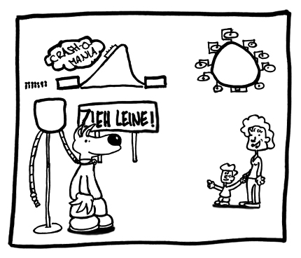 Schöne Gag-Idee. Der Hund ist süß gezeichnet. Was mich ein wenig irritiert ist, dass man das "Crash-O-Mania" im ersten Moment als Information wertet, die für das Verständnis des Gags wichtig ist. Ohne das wäre der Gag schneller beim Leser.