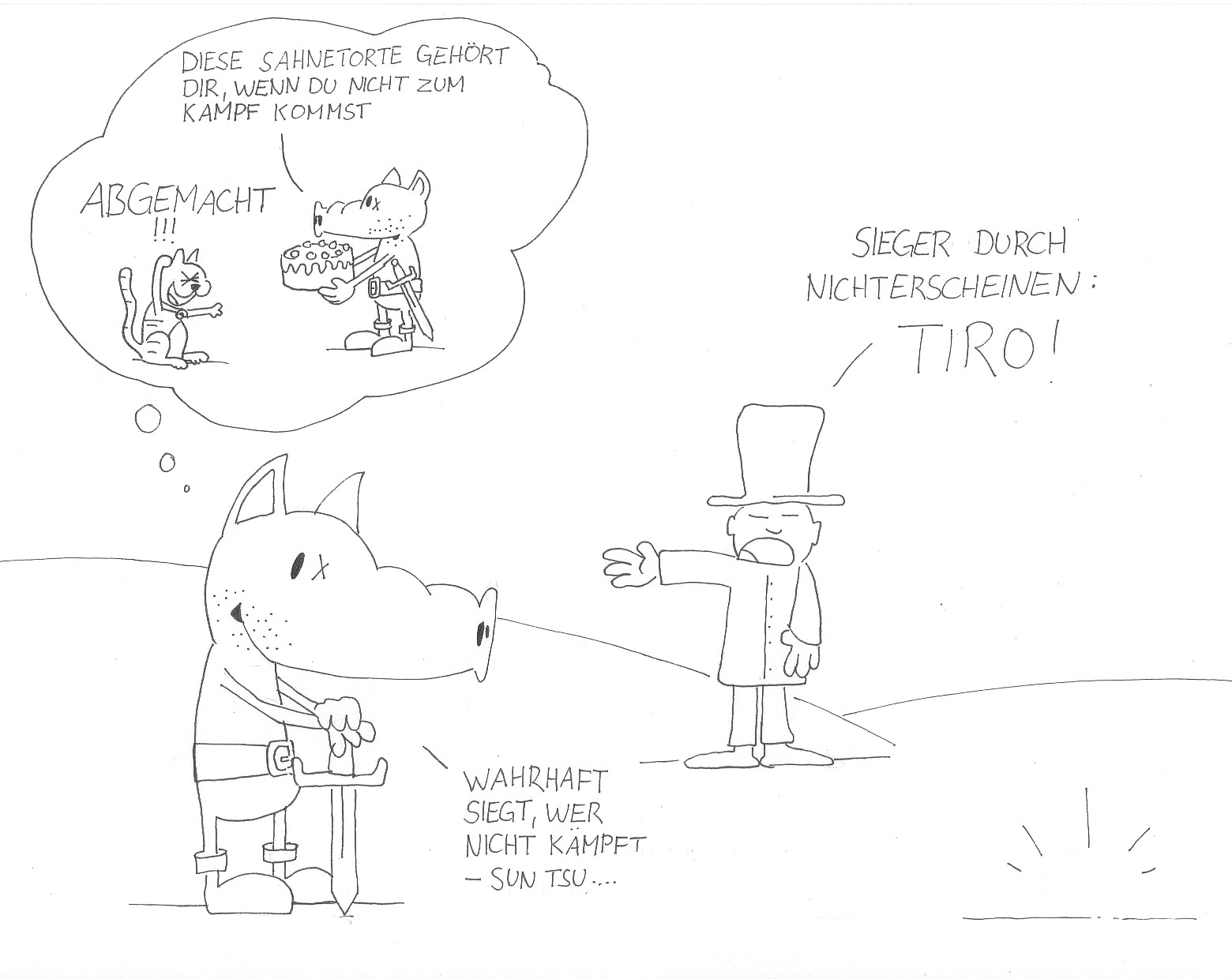 So eine Torte wirkt halt manchmal Wunder :D Mir gefällt dieser liebenswerte Stil unglaublich gut und klasse find ich auch, wie du darauf eingehst, dass kurz vor Schluss noch keiner der Kämpfer da war :D Kurz ich find alles total klasse! =) Naja, Farbe wär vielleicht noch schön gewesen und man soll ja den Tag auch nicht vo dem Abend loben: Vielleicht hat die Torte nicht geschmackt und es kommt doch noch zum Kampf?! ;)