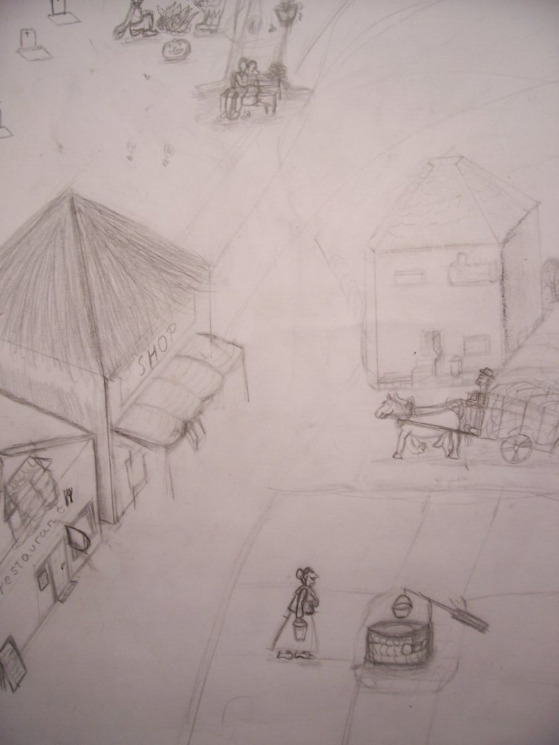 und hier die Fortsetzung von dem Dorf, im Moment ist es noch auf DinA3, aber werd es jetzt umzeichnen im Din A2 Format. Und unten rechts kommt warscheinlich noch ein MArkt hin
