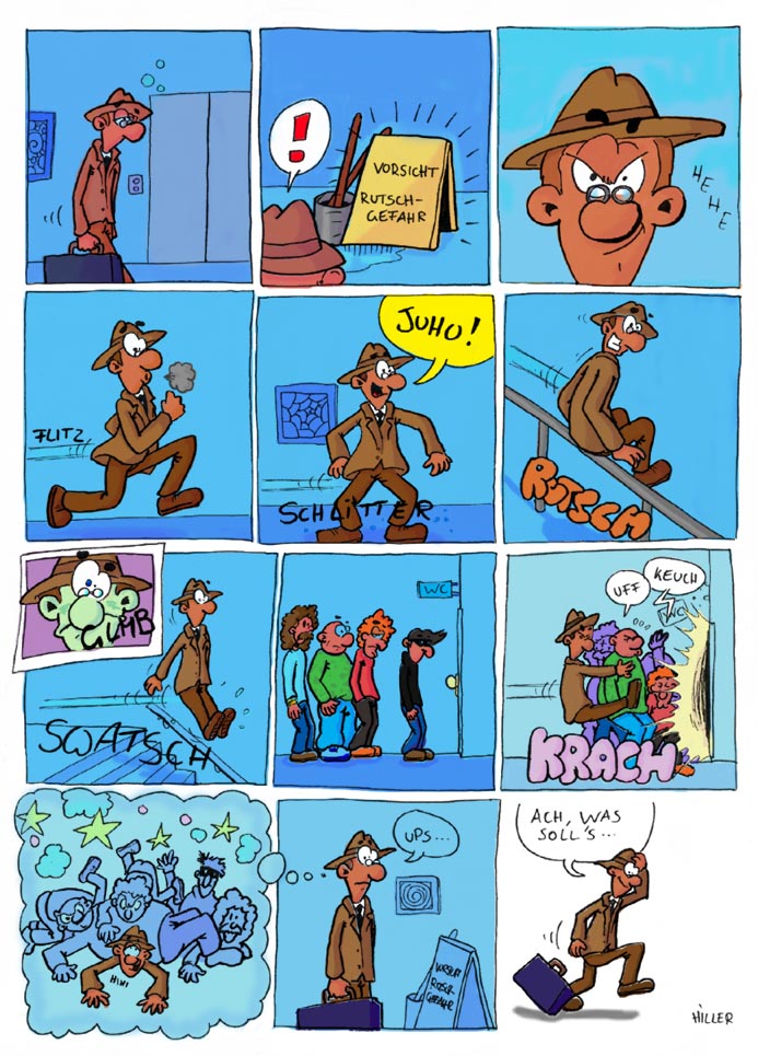 Ich habe allerdings ein paar Schwierigkeiten, vom fünften zum sechsten zum siebten Bild der Handlung zu folgen...?! Na ja, und das "Ups" im vorletzten Bild sollte in eine weiße Sprechblase; und nach so viel Blau finde ich den Übergang zum Weiß im letzten Bild irgendwie nicht ausreichend motiviert. Das "Schlitter" ist so dünn und so schwarz nicht sehr leserfreundlich, und ein rosa-rundes "Krach" sehe ich auch zum ersten Mal ;) :D