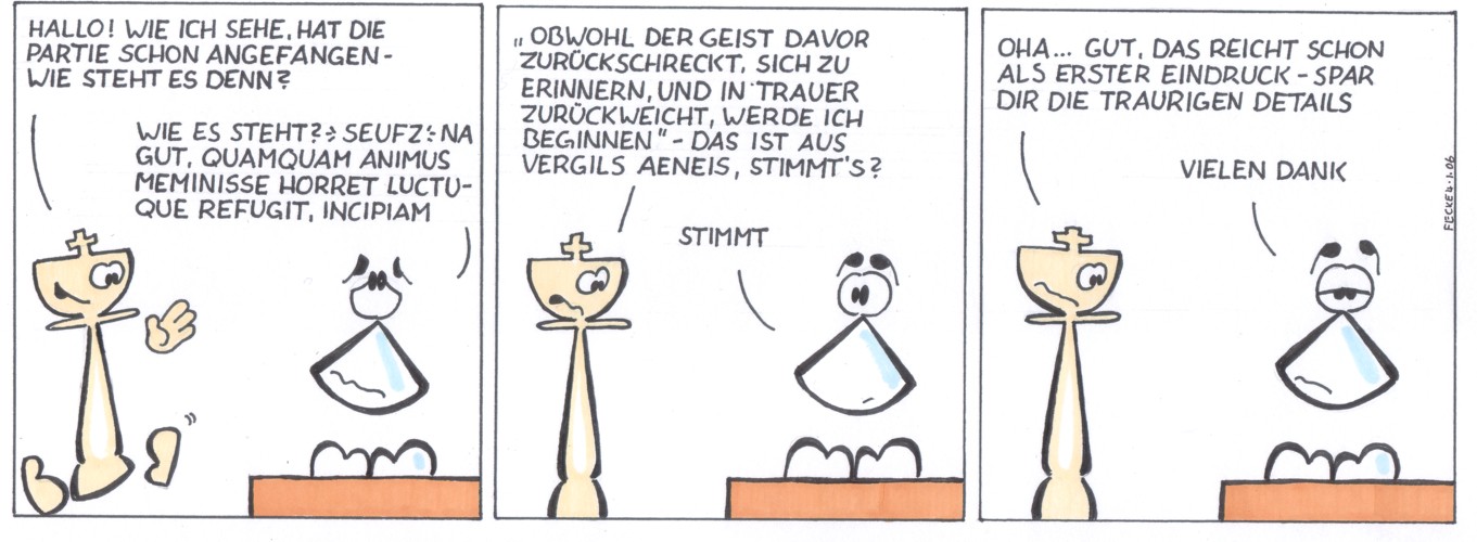 Zum Inhalt: Die Reporter-Story geht erst morgen weiter, weil mir noch nicht klar ist, auf wieviele Strips ich sie verteile, das da unten ist also ein Lückenfüller; als Vertreter jahrtausendealter Spiele haben natürlich sowohl Schachkönig als auch Gostein umfassende Kenntnisse der griechischen und römischen Literatur ;) :D
