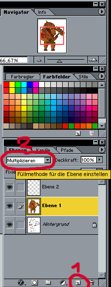 Den Ebenenmodus kannst du in dem Fenster 2 verändern.