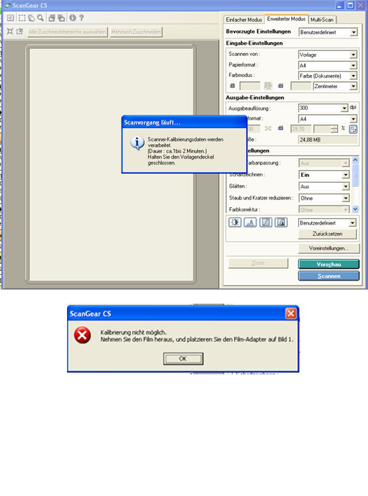 Also wie immer normal die Treiber installiert, neu gestartet und Scanner angeschlossen. Leider kamen schon die ersten Fehlermeldungen nach einigem hin und her habe ich einfach mal das Kabel vom alten Scanner angeschlossen und schon ging es. Jetzt war ich erst einmal euphorisch und dachte, dass ich endlich scannen darf. Aber FALSCH GEDACHT! X(