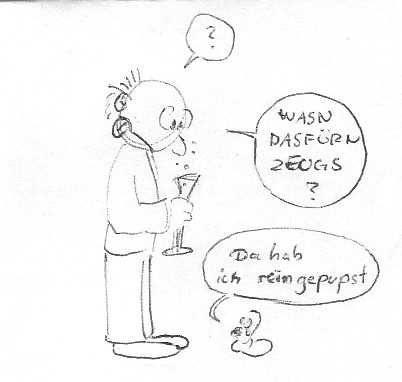 Rastafisch und Ferdi... aufgehängt? Na ja, nicht wirklich :) Aber Rasta und ich waren heute nachmittag in einer Lippstädter Kneipe und haben die Wände mit Comics und Cartoons von uns vollgehängt :) Und da das sozusagen eine Austellung ist, eröffnete der lächelnde Wirt die Ausstellung im kleinsten Kreis mit einem Gläschen... Warum ich euch das allesl erzähle? Na weil Rasta und ich dabei natürlich auch ein wenig gezeichnet haben... ein ganz ganz ganz kleines bisschen... unten zu sehen, Kugelschreiber auf Kneipenblock ;) :D