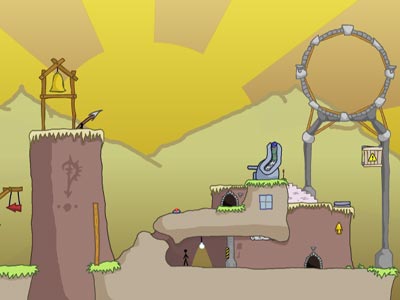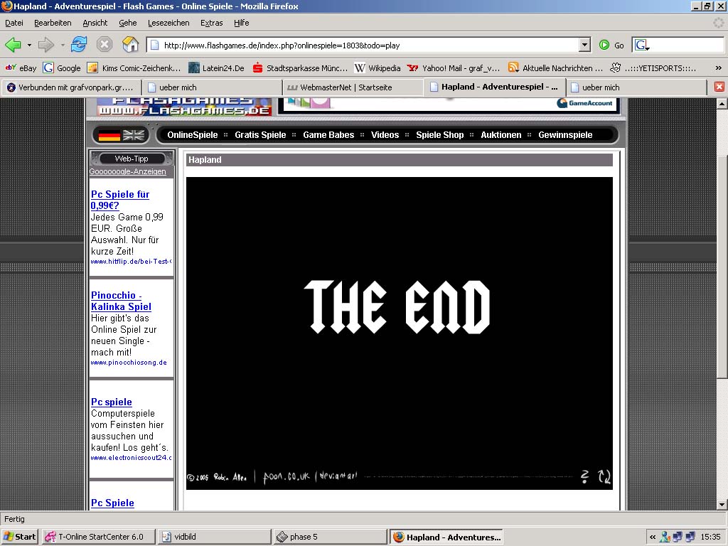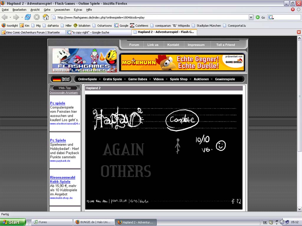 Bei Hapland 2 zum Beispiel, muss man das Schild neben der Figur umdrehen, sodass ein Pfeil angezeigt wird, wenn man dann draufklickt geht das Männchen in die Richtung. Wenn man nochmal draufklickt hüpft sie runter vom Haus. Wenn man dann den Pfeil der beim Haus hängt auch noch umdreht, rüttelt es an der Tür, so lange bis dieses grüne Vieh runterfällt. Dann muss man den Pfeil wieder umdrehen und bei der Krähe auf der Burg die Lampe anschalten, so dass sie auf diese Kugeln scheint, dann auf die Krähe klickten damit sie eine Kugel mitnimmt. Wenn sie dann über der ersten Wolke ist, klickt man auf diese, der Vogel lässt die Kugel fallen und die zerstört so ein Kabelnetz am Boden. Jetzt kann man wieder auf das grüne teil klicken, es wandert nach unten und kann problemlos ins wasser hüpfen.