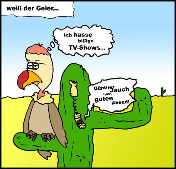 Wenn er einfach nur den Höhrer am Ohr hätte und genervt guckt, fänd ichs besser."Weiss der Geier" oben im Kästechen, "Guten Abend hier ist Günther Jauch" in die Sprechblase vom Höhrer (kannst Du mit scharf gezacktem Sprechblasenfeil darstellen)