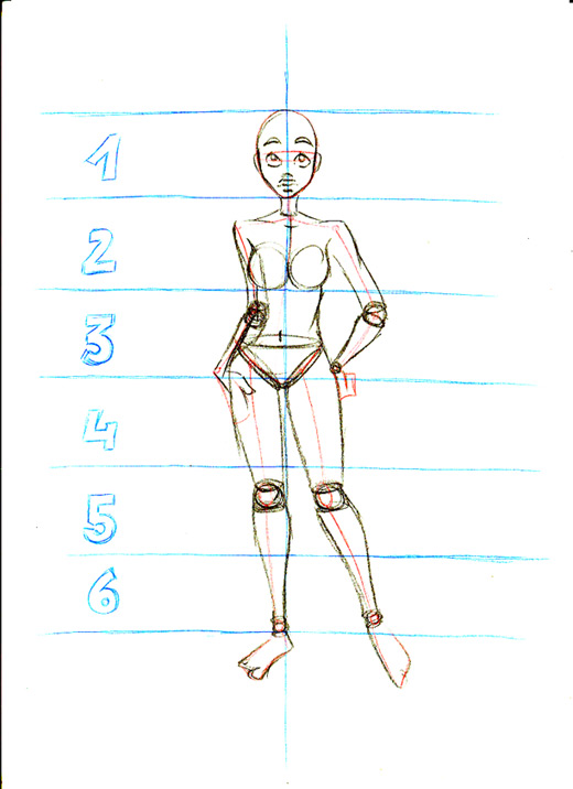 Ich beginne immer mit einer Strichmännchenzeichnung um die Pose grob festzulegen. Die wichtigen Gelenke markiere ich dabei mit kleinen Punkten oder Kreisen. Wie ihr an den waagrechten Linien seht ist mein Strichmännchen 6 Köpfe groß (manchmal auch etwas mehr, je nach dem). Ich habe die Linien hier sehr deutlich eingezeichnet, damit es leicht erkennbar ist, aber auch wenn ich einfach nur so zeichne unterteile ich die Figur mit kleinen Punkten oder Strichen in ihre Kopfgrößen. So ist es am einfachsten die Proportionen einzuhalten.