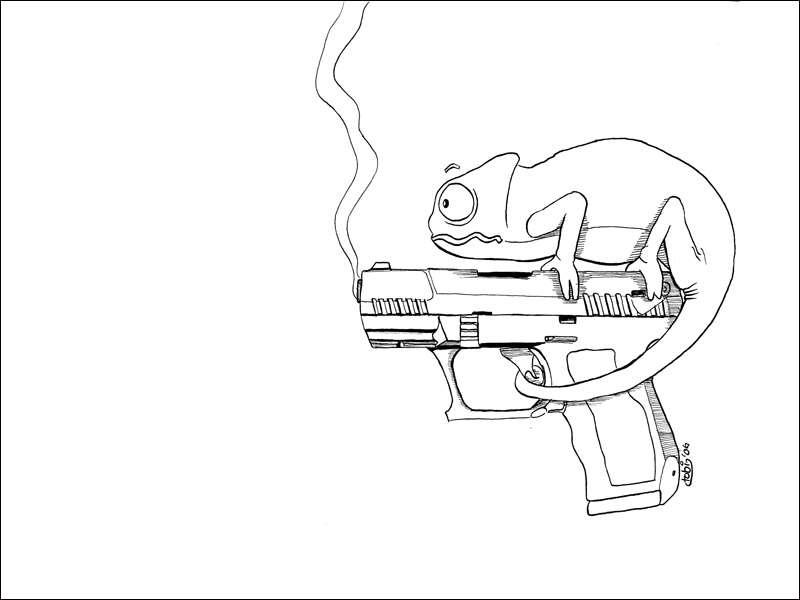 Die Idee mit einem Chamäleon auf einer abgeschossenen Waffe, hab ich irgendwo mal aufgeschnappt. Die Idee hat mir so gut gefallen, dass ich sie selbst nochmal umgesetzt habe.