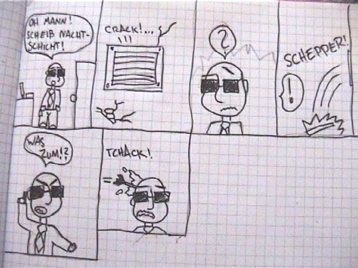 hab mich gestern mal hingesetzt, mein schwarzes büchlein ausgepackt und drin rumgezeichnet... dann kam ich auf die idee mal einen comic anzufangen... mit den zeichnungen bin ich ganz zufrieden ( [frage an mich selbst] bin ich irgendwie in letzter zeit besser geworden?