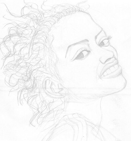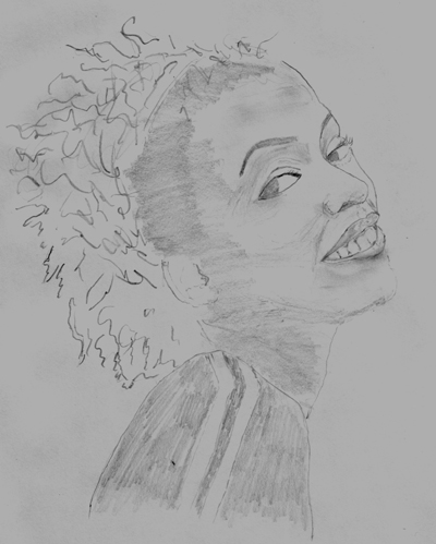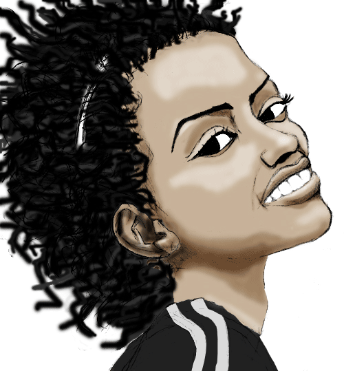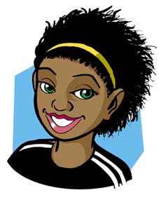 Hier meine Comicversion. Die typischen Merkmale bei dem Mädel sind doch klar: Große Augen, sympathisches Lächeln, krause Frisur mit Haarreif und Streifenpulli.