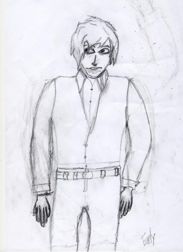 Am Anfang würde ich ihn jetzt vielleicht erstmal zeichnen, wenn er beide Arme unten hat. Der Abstand zwischen Arm und Körper ist auch etwas zu groß. Im gesammten vielleicht alles etwas lockerer zeichnen und nicht zu eckig. :) ;)