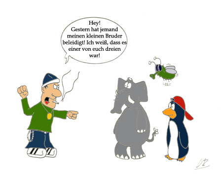 als ich das Bild sah (das ich übrigens von seinen Elementen - Elefant, Pinguin, Insekt - äußerst cool und witzig finde) wartete ich mit jedem Wort mehr, das ich las, auf die große Pointe - aber da kam nichts.