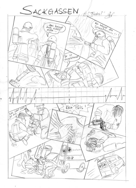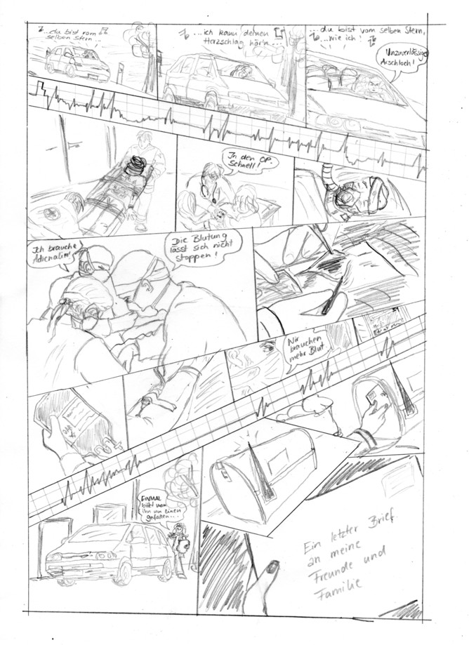 Erstmal gibt es aber die 1. Seite nochmal reloaded - mit neuem EKG und im oberen Bild hab ich dem Sanitäter eine Defi in die Hände gezeichnet, das passt mir irgendwie besser in die Kontinuität.