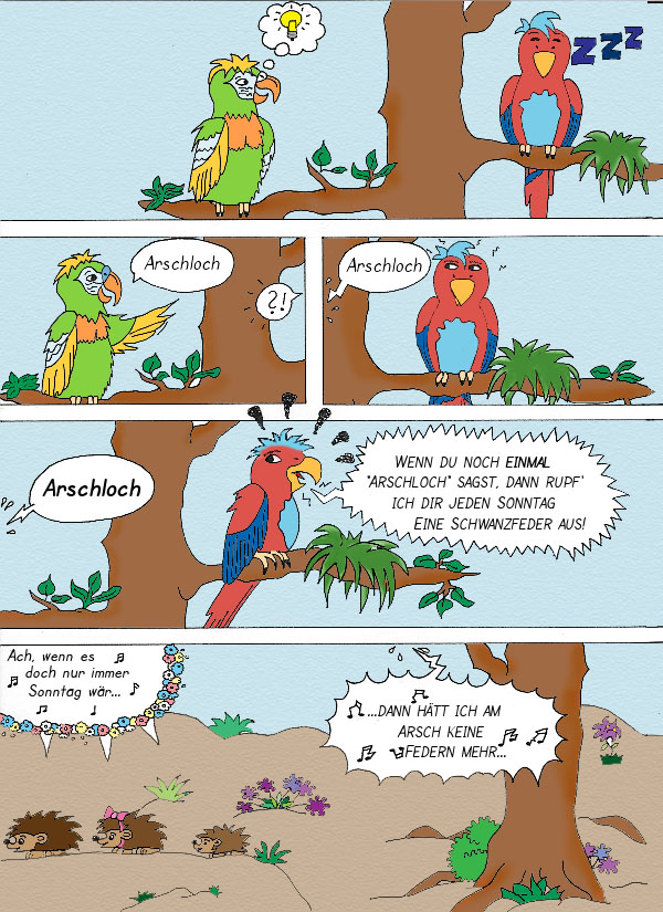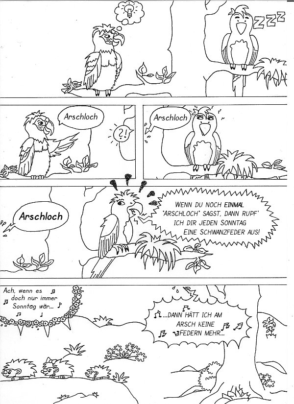 Habe gestern und heute mal einen Papageien-Comic gemalt (aber aus einem schon vorhandendem Witz, mein kleiner Bruder findet den so gut - ich kann ne jetzt nicht mehr hören^^). Da das so ziemlich mein erster Kontakt mit Photoshop und der Colorierung war, lad ich zum Vergleich noch mal die "rohe" Version hoch :)).