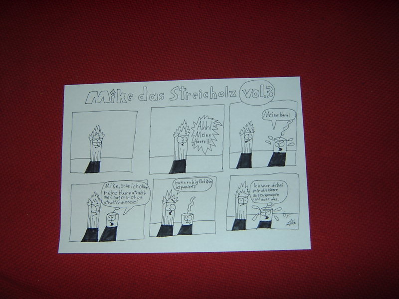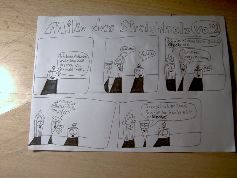 So Kinnas, jetzt binn ich drann Sachen zu präsentieren, nämlich meinen (erst Gestern entstandenen) Kumpel Mike das Streichholz!!! ^^ Mike das Streichholz soll ein kurzer Comic-strip werden den ich wöchentlich hier im Forum präsentieren will. Doch wie gesagt ist er erst Gestern in einer sau-langeweiligen Erdkunde-stunde entstanden, deshalb werde ich hier zwei grobe Zeichnungen von ihm reinstellen und ihr könnt mir sagen (oder auch nicht :P ) welcher eurer meinung nach besser ist. So genug vom Vorblabla hier ist meine Zeichnung: