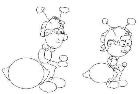 Eine hat einen runderen Kopf mit sehr viel höherer Stirn und kürzere Gliedmaßen, dadurch sieht sie um einiges jünger aus. Nach diesem Gerüst würd ich vorgehen. Vielleicht noch nen Lolly in die Hand, oder eine Steinschleuder, je nachdem was zur Geschichte passt und keiner zweifelt mehr daran, dass das ein Ameisenjunge sein soll.
