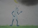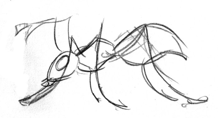 Und hier hab ich Dir mal schnell in Paint das Grundgerüst gezeichnet, so wie ich die Ameisen zeichnen würde und wie es die Leute vor mir ja schon beschrieben haben. Ist mehr oder weniger ein schief zusammengebauter Schneemann, bei dem die mittlere Kugel ziemlich klein geraten ist. Am Kopf noch Fühler ran und fertig: