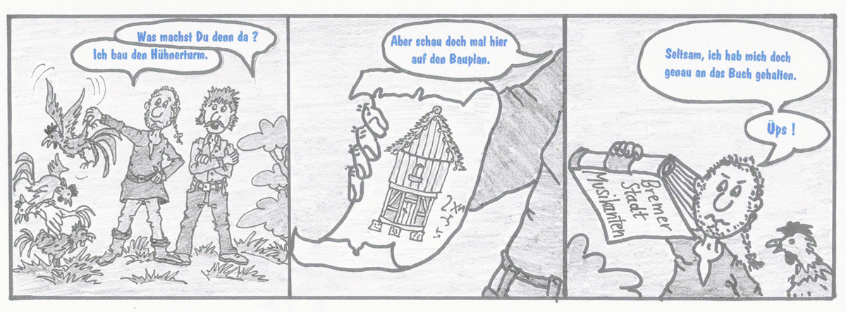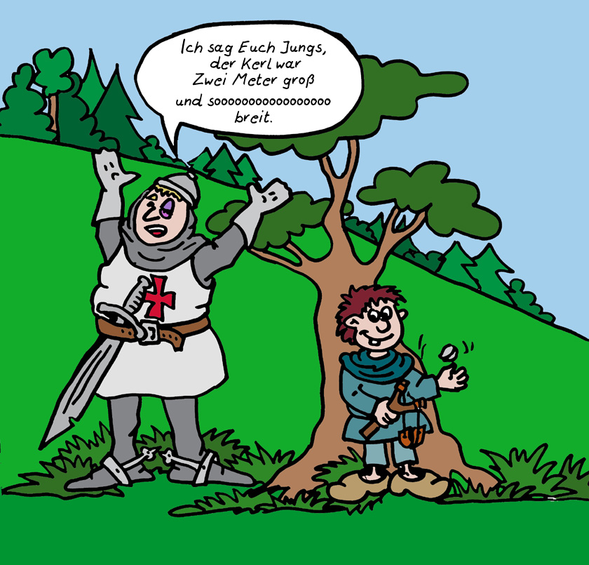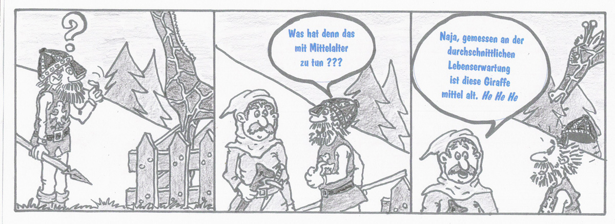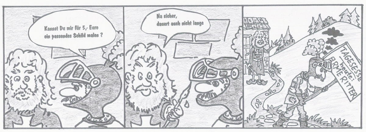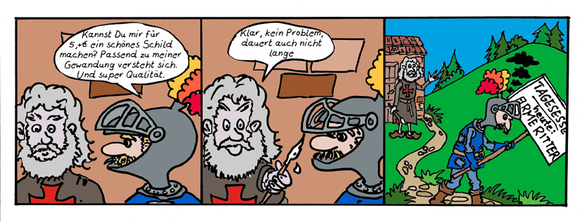 Vielleicht noch ein wenig überlegen, wie man die Bilder anlegen kann, dass sie den Witz mehr unterstützen. Beim Letzten zum Beispiel ist der Junge so offen erkennbar zusammen mit dem Ritter im Vordergrund platziert, der dazu noch mit der Luft redet, dass alles zu eindimensional und leblos wirkt. Dem Ritter ein paar sichtbare Zuhörer spendieren und den Jungen für den Ritter und sein Publikum verstecken (reicht, wenn die Leser ihn sehen/erkennen können) und schon wirkt das ganze lebendiger und wird interessanter für den Betrachter.