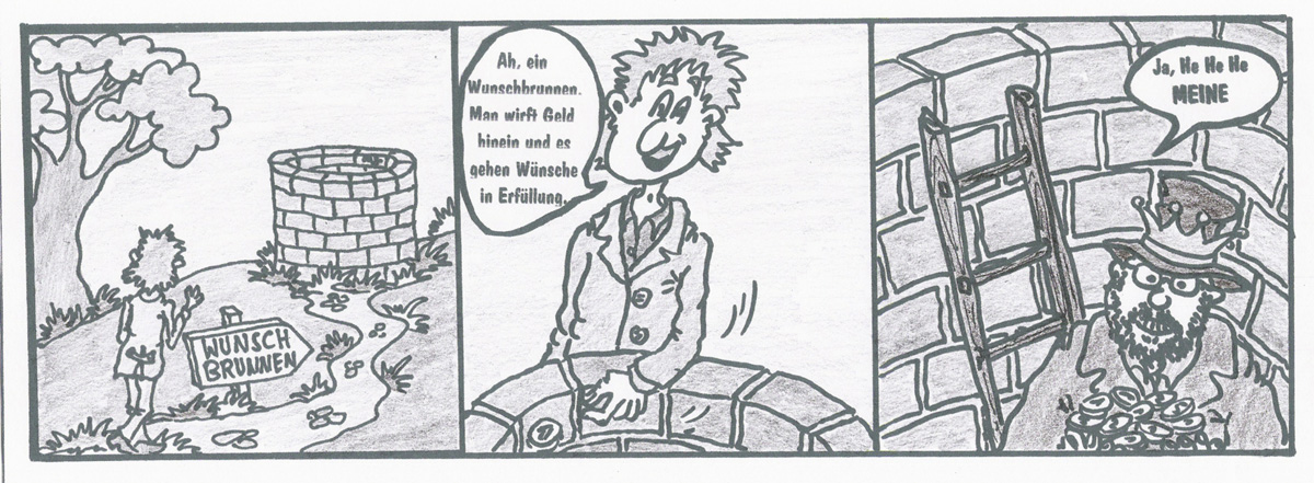 Bei dem Wunschbrunnenwitz find ich jede Sprechblase unnötig. Das Schild sagt schon, dass es ein Wunschbrunnen ist, und dessen Funktion ist ja allgemein bekannt.