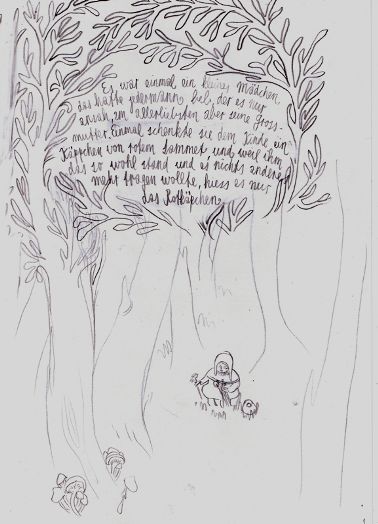 also, die erste seite mit dem prolog fängt tatsächlich genau so an wie das ursprüngliche märchen. in meiner version aber verirrt sich das rotkäppchen im wald und trifft auf eine lichtung, wo der wolf an einem runden tisch pfeife raucht. sie fragt ihn naiv und ahnungslos wie sie ist, ob er ihr denn den weg zur grossmutter zeigen könnte. der wolf fragt, wo denn die oma wohne. hinter den drei eichen, antwortet das mädchen. also gut, meint der wolf, ich zeig dir den weg, wenn du mit mir ein spiel mitspielst (auf dem tisch liegen pokerkarten und chips, aber ich mache das gemeinte spiel absichtlich nicht offensichtlich, weil es nicht wichtig ist für den verlauf der geschichte, das wichtige ist einfach das es ein (karten)spiel ist) das spiel soll 3 runden gehen. wer eine runde verliert muss dem gewinner gold bezahlen. rotkäppchen ist einverstanden, obwohl sie kein gold hat (aber sie ist ja sowieso naiv). sie spielen und rotkäppchen verliert alle 3 runden. in der ersten runde muss sie als anzahlung ihre rote kappe geben, in der zweiten ihren roten überrock und in der dritten ihren korb.