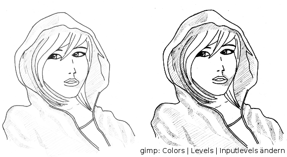 Die Sache mit der Gradiationskurve hat ziemlich gut geklappt, allerdings nur bis zum einfärben. Wenn ich das Bild vorher nicht in schwarz/weiss umwandel, habe ich um meine Bleistiftlinien weisse Umrandungen. Und wenn ich es in s/w konvertiere, ist das Ergebnis natürlich ein ganz anderes, als gewollt.