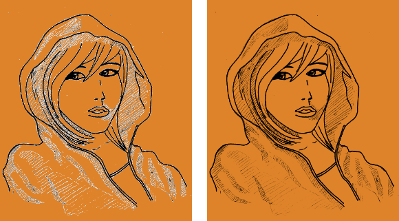 dadurch daß ich keine ganz schwarzen outlines hab sondern nur bleistift, ist der kontrast nicht so stark und auch die hellen schattierungen sind noch gut sichtbar.