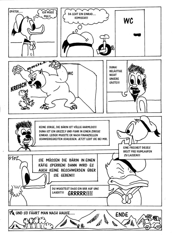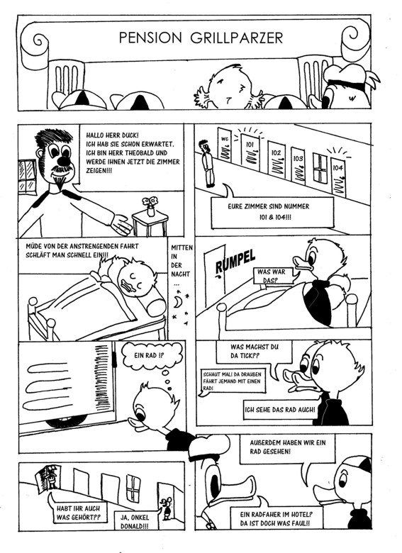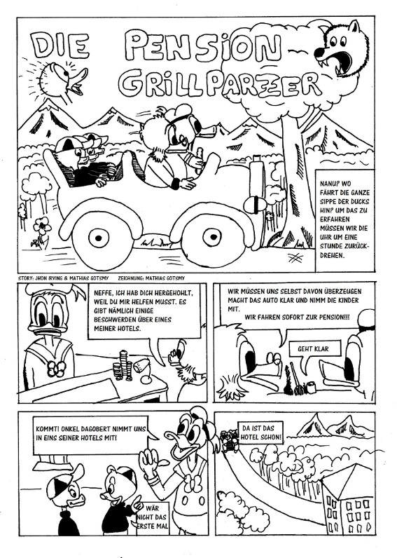 Mein Tipp an dich wäre, mal zu versuchen, von den Ducks wegzukommen und eigene Figuren zu erfinden. Das Abpausen von Carl Barks hat keine Zukunft und ist streng genommen auch strafbar, weil du zwar erwähnst, dass die Pension Grillparzer von John Irving ist, aber nicht, von wem die Charaktere stammen.