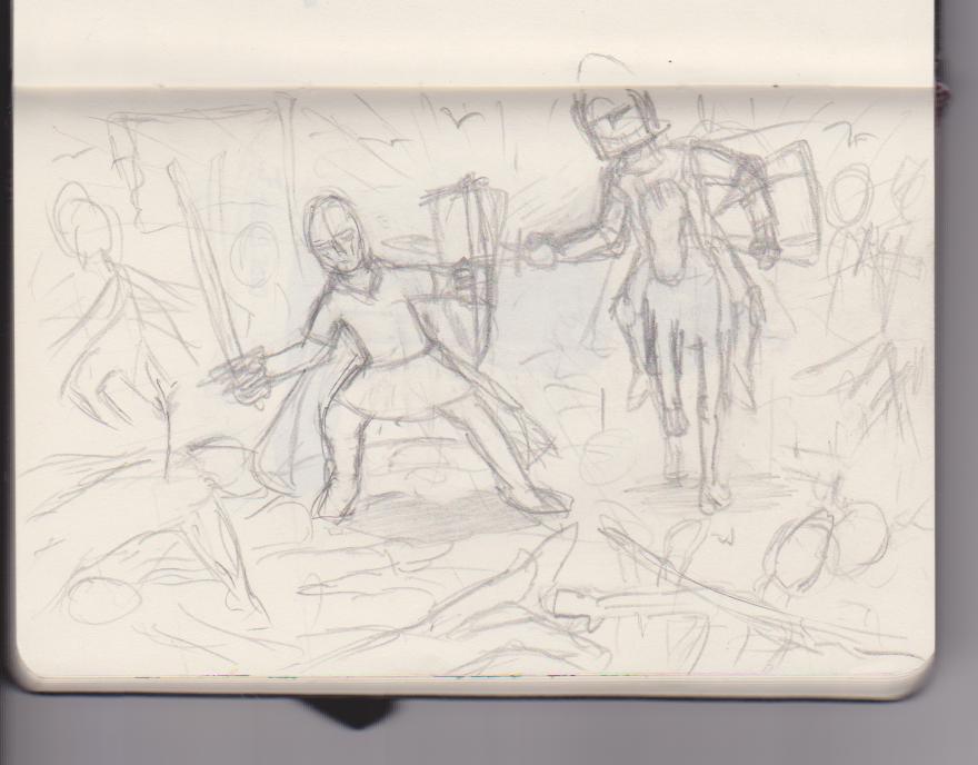 Ein neues Bild und dessen Vorzeichnung. ich habe die Vorzeichnung eingescannt, eine neue Ebene drübergelegt, auf der dann die Skizze nachgezeichnet und koloriert. Zum Schlusshabe ich die Vorzeichnung gelöscht und eine Hintergrund-Ebene erstellt und koloriert.