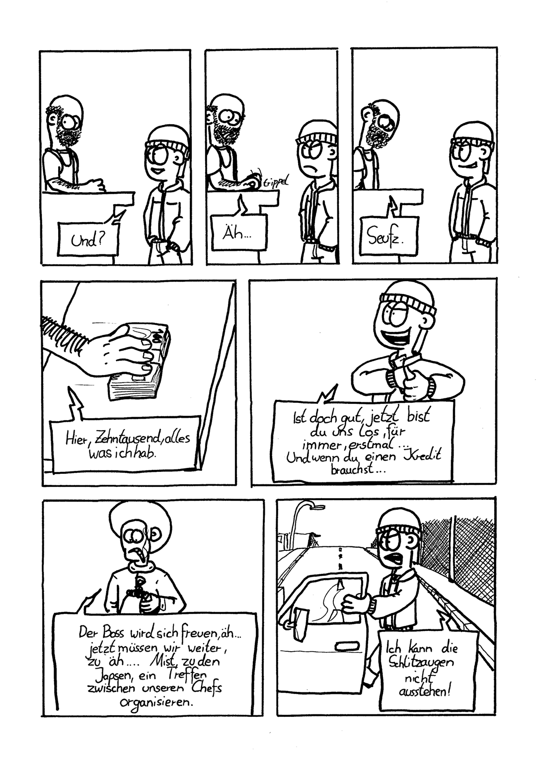 In den letzten beiden Panels auf Seite 5 sind dir plötzlich die Hintergründe abhanden gekommen. Ansonsten hat die Geschichte "Suspence", das heißt sie ist so erzählt, daß man sich immer fragt wie es denn jetzt weitergeht.