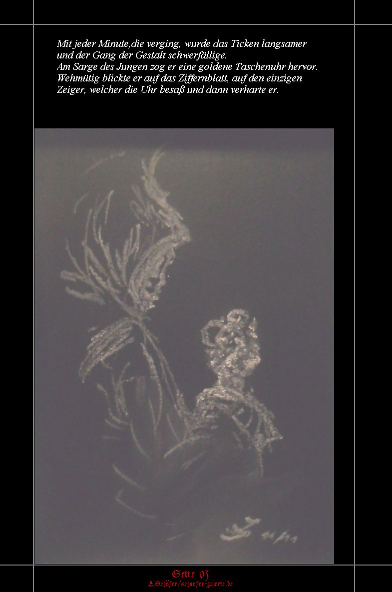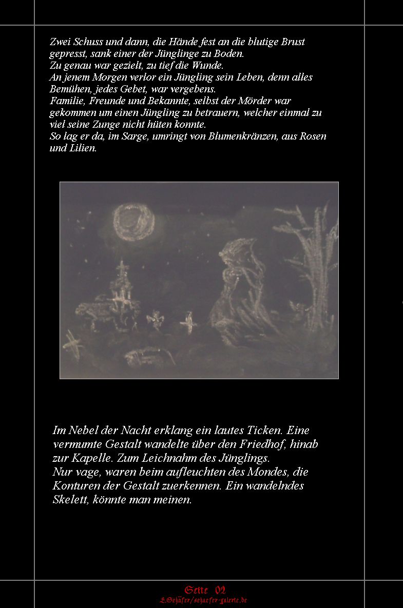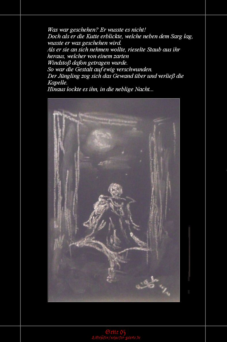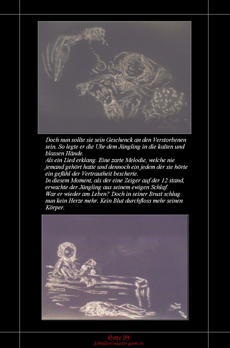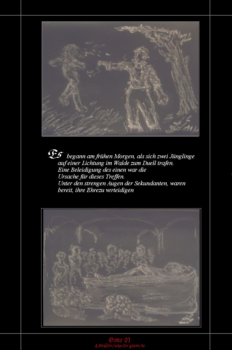 Das ist doch mal echt schön. Die Skizzenhaftigkeit der Zeichnungen passt auch gut zu dem düsteren Text. Vielleicht solltest du die Umrisslinien noch ein klein wenig nachschärfen. Ist das auf einer Tafel gezeichnet, das Titelbild sieht fast so aus?