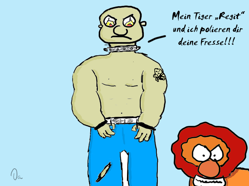 Der Löwe is zwar klein, aber so respeckteinflößend wie der Blick des Typen!! Cool!