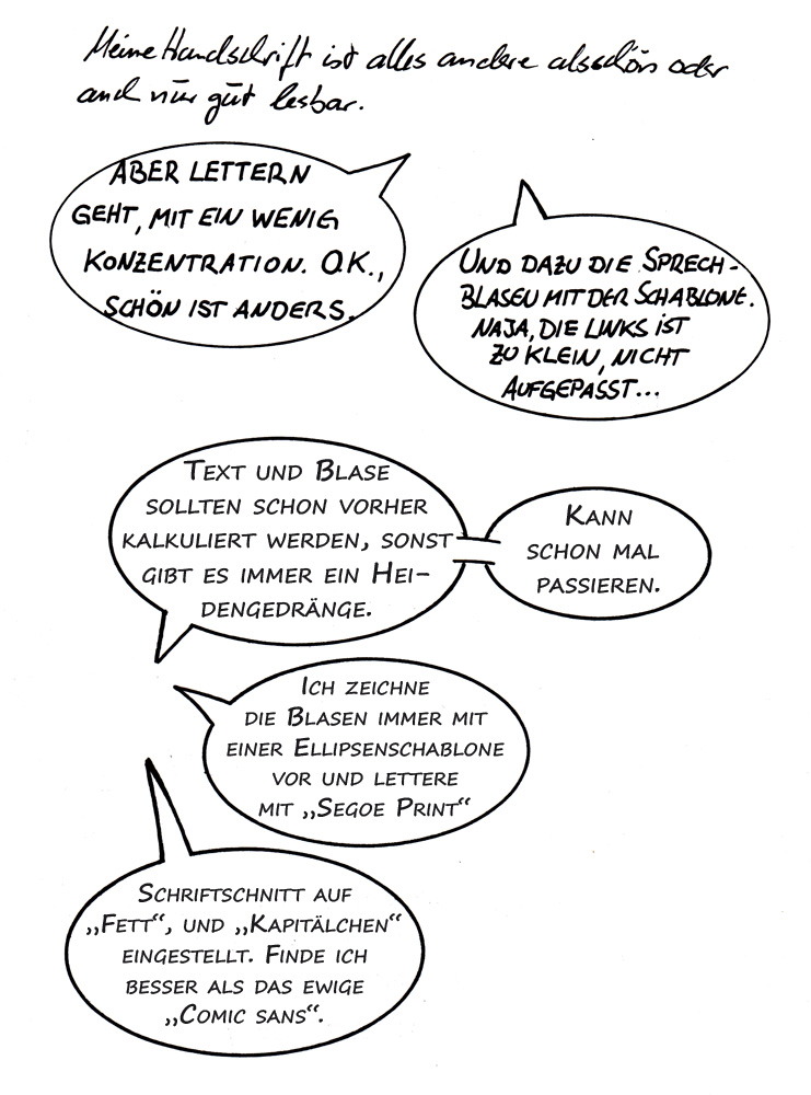 Früher hatte ich mir einen Satz Ellipsen ausgedruckt, daraus habe ich dann am Fenster (später am Leuchttisch) die passenden als Sprechblasen abgepaust. Dann wie gesagt mit der Standardgraph DIN5 Ellipsenschablone. Und jetzt werde ich das wohl öfter mit Sketchbook (Programm) machen, das Ellipsenwerkzeug ist einfach nur der Hammer.