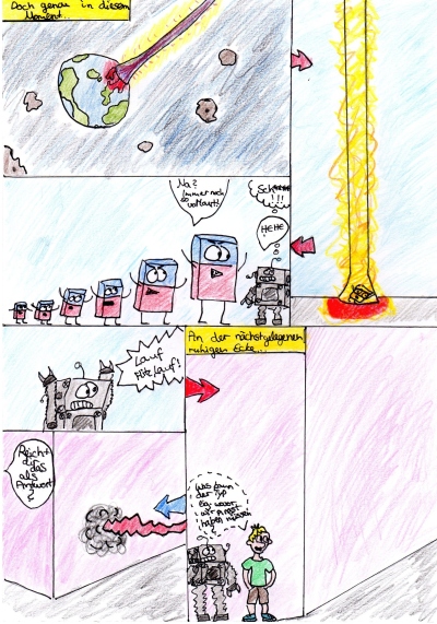 Wenn etwa der Roboter das Radiergummi nimmt, sollte er vorher schon direkt daneben im Bild sein, damit man ihm den Arm gleich zuordnen kann. Natürlich erkennt man es auch so einen Moment später, da er halt verdammt nochmal der einzige Roboter vor Ort ist, aber so ginge es instinktiver. Auch auf der zweiten Seite ist es etwas ungünstig, dass das Panel, auf dem das Radiergummi wächst (an sich ein hübscher Effekt) vom Auge des Lesers von rechts "betreten" wird, so dass man den Vorgang gewissermaßen rückwärts erfasst und es schrumpft.