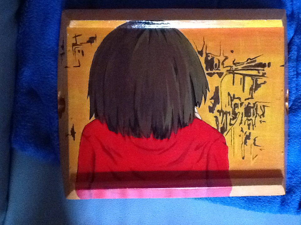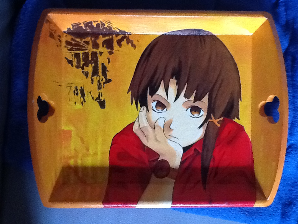 Auch von mir gemacht auf einem Holztablett mit Dispersionsfarbe und Lack, die Figur stammt aber nicht von mir, die ist aus der Anime Serie "Serial Experiment Lain".