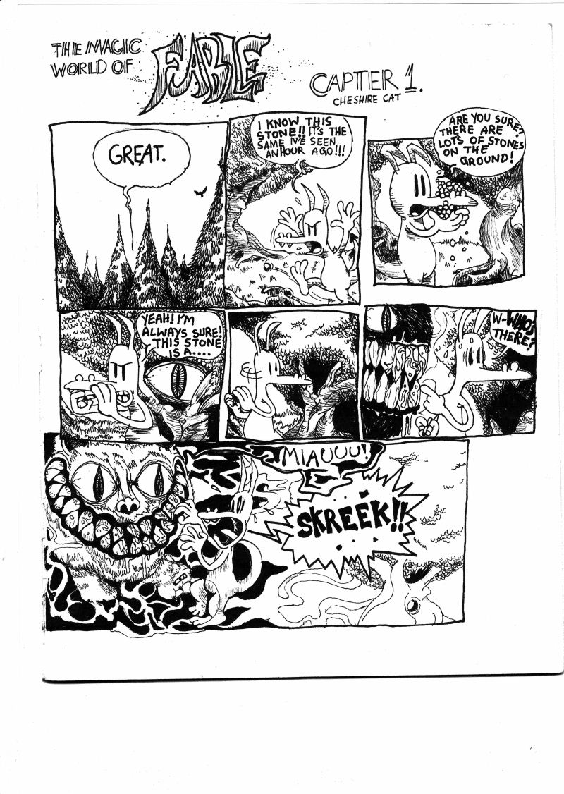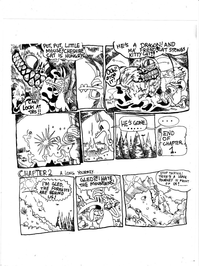 Ich würde die Panels etwas mehr voneinander absetzen, mit zwei oder drei Millimetern Luft dazwischen wäre das Blatt übersichtlicher. Und es wirkt ein bißchen so, als wäre er sich noch nicht einig, in welche Richtung sich das Ganze entwickeln soll. Einige Szenen strotzen vor Details und sind bis ins letzte ausgezeichnet, bei anderen hat er sich Arbeit ersparen wollen und sehr vereinfacht. Das führt z. B. dazu, daß die (Grinse) Katze ziemlich undefiniert ist.