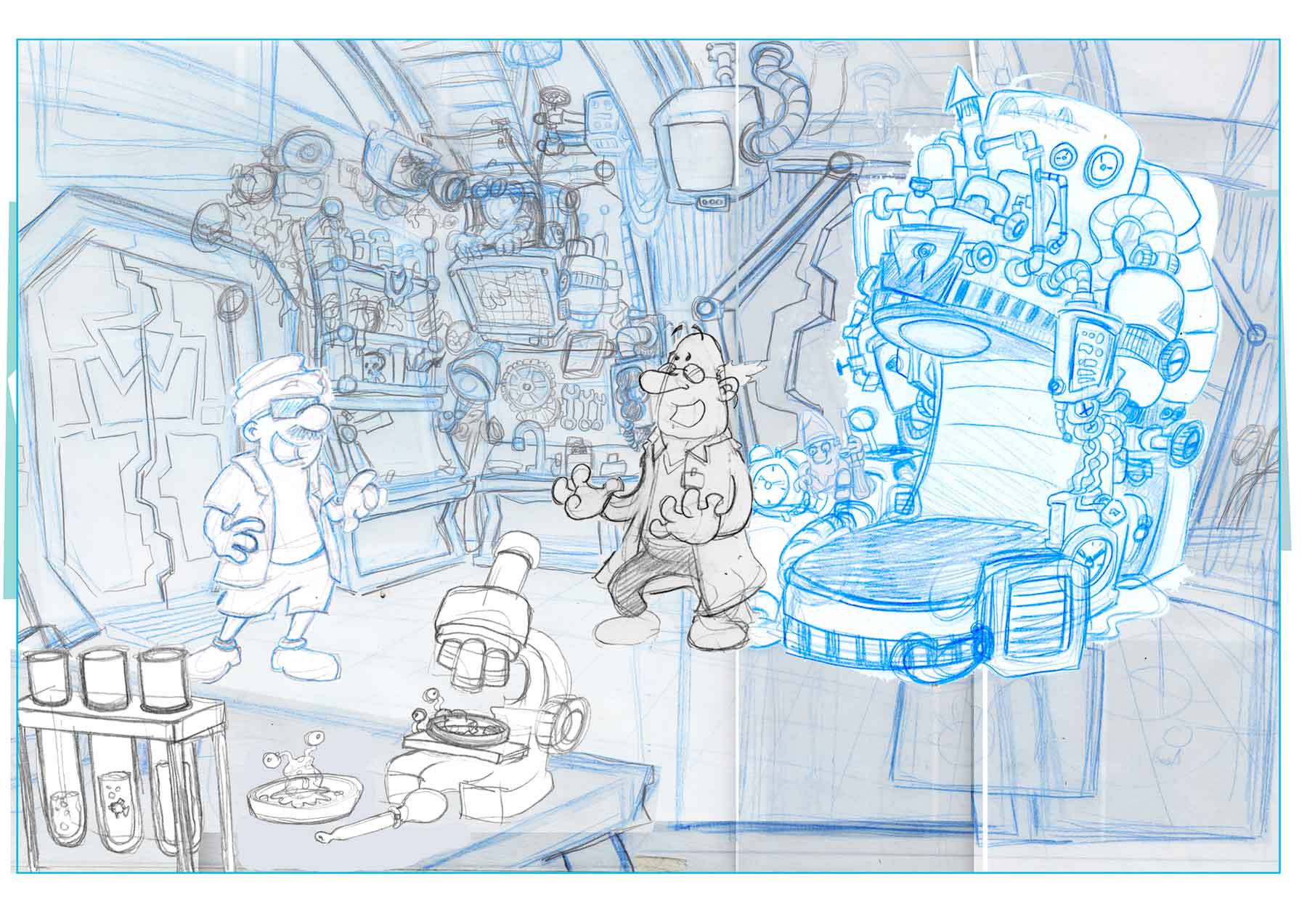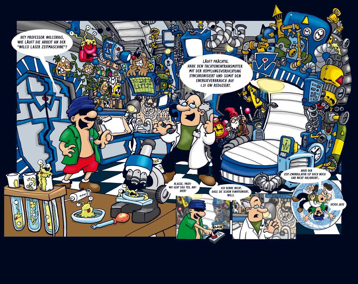 Das ganze ist eine Auftragsarbeit. Seit über 10 Jahren zeichne ich für eine Firma einen Kalender mit Wimmelbildern. Letztes Jahr habe ich für dieses Jahr zum ersten mal eine zusammenhängende Story geschrieben und gezeichnet.