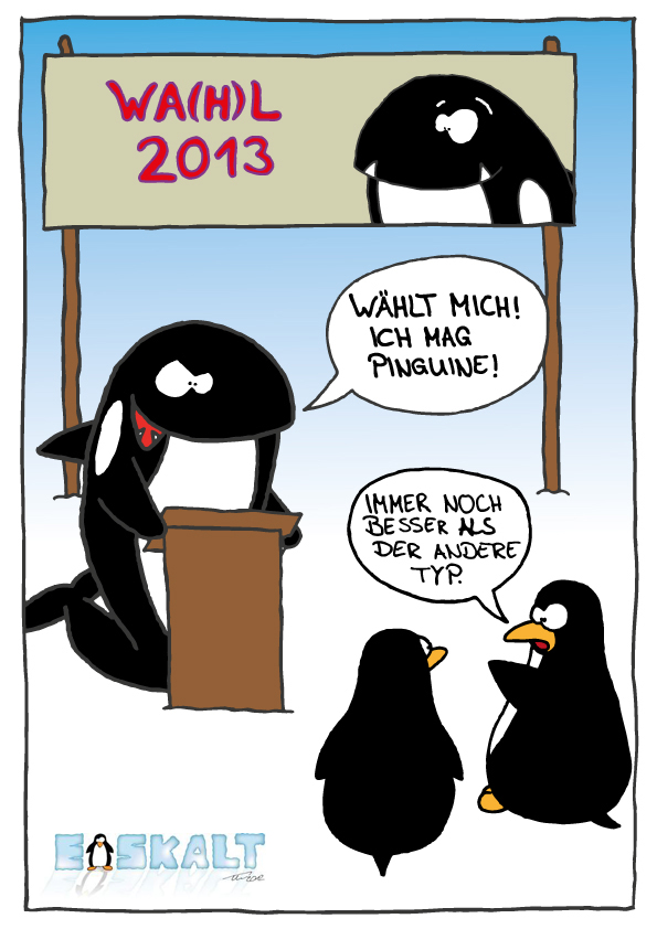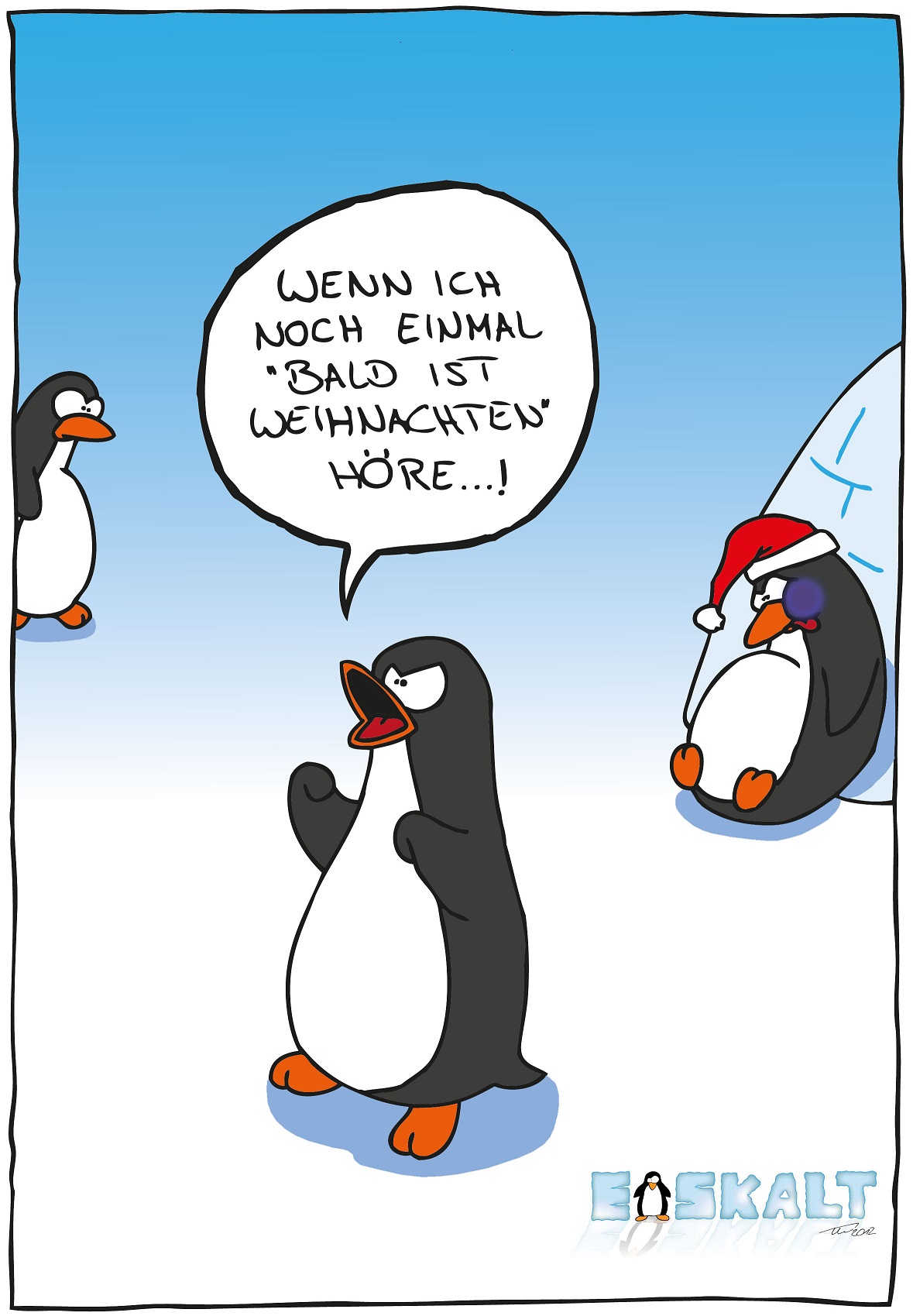 Der erste Pinguin regt sich auf, weil alle faseln: "Bald ist Weihnachten, bald ist Weihnachten!", wobei sich der Pinguin hinten rechts zusammenreißen muss, es nicht zu sagen, da er schon voll inWeihnachtsstimmung ist. :)