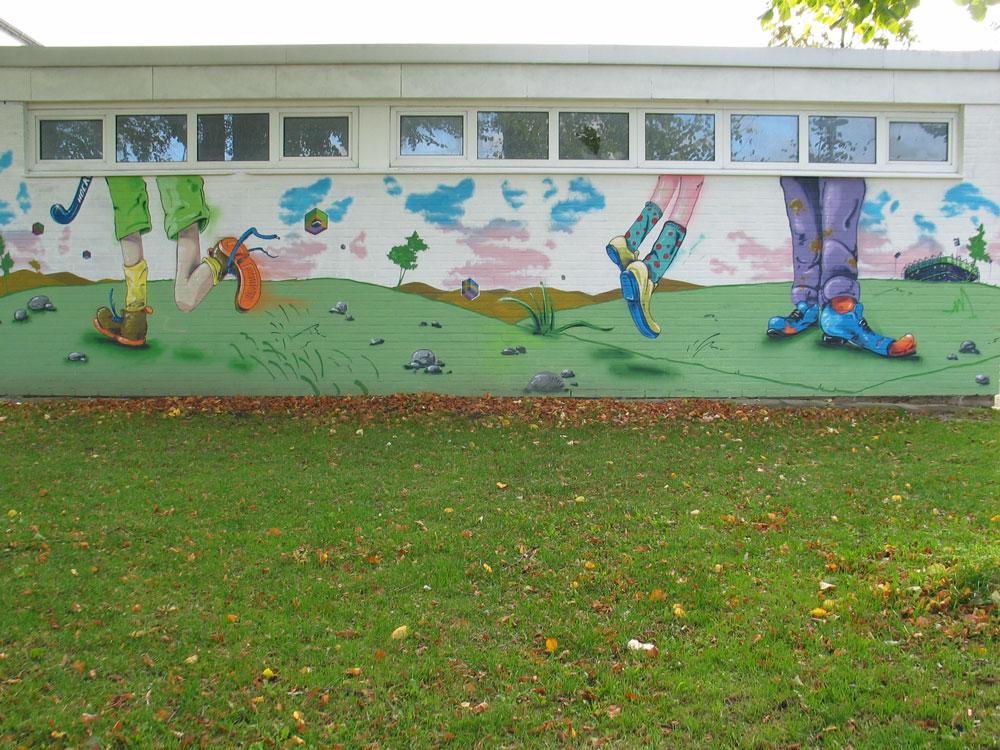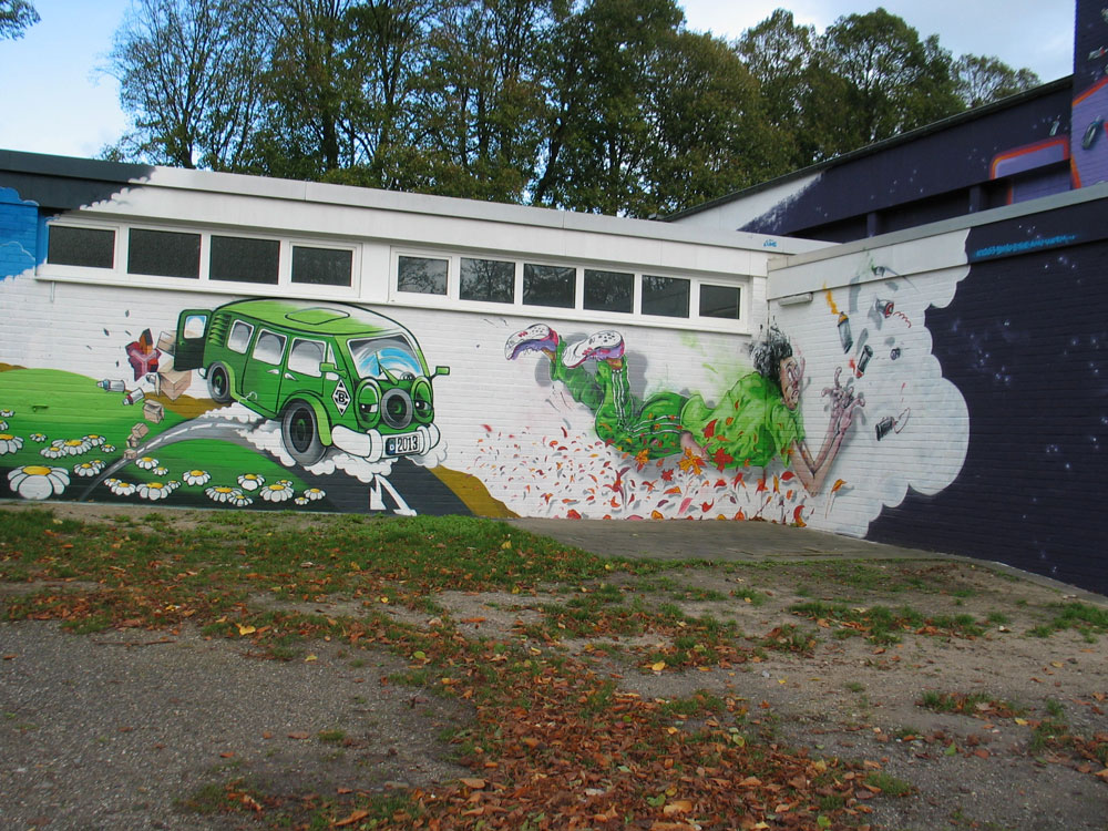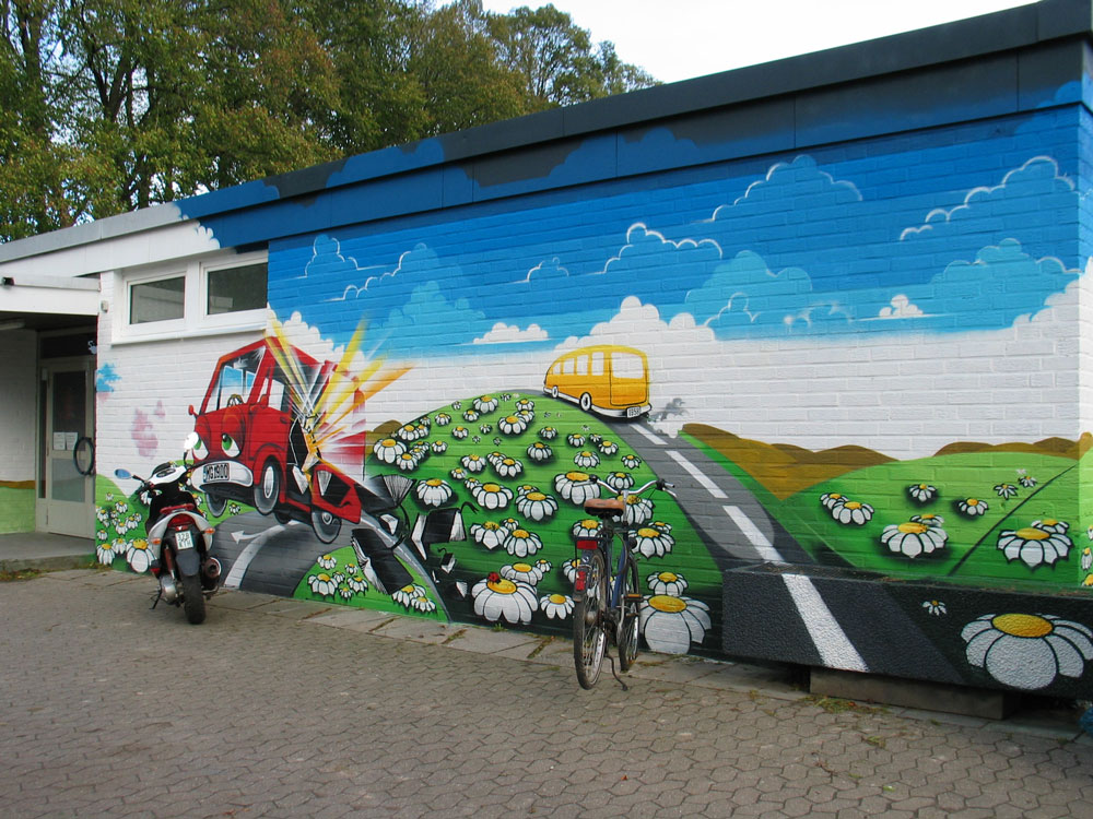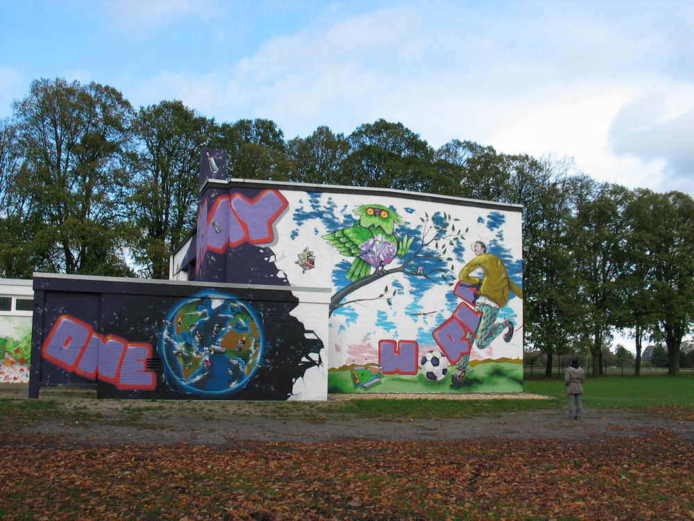 Ursprünglich wollte man wohl auch nur dem Vandalismus und den ewigen Sprayer-„Schmierereien“ an der Turnhalle durch professionelle Graffitis an einer Wand beikommen. Daraus wurde schließlich, abgesehen von der Vorbereitungszeit, ein 8-tägiges professionell gesponsertes Ereignis, in das eine Schule und die komplette Gemeinde vom Kindergarten übers Altenheim bis zur katholischen Landjugend und der Schützenbruderschaft einbezogen waren.