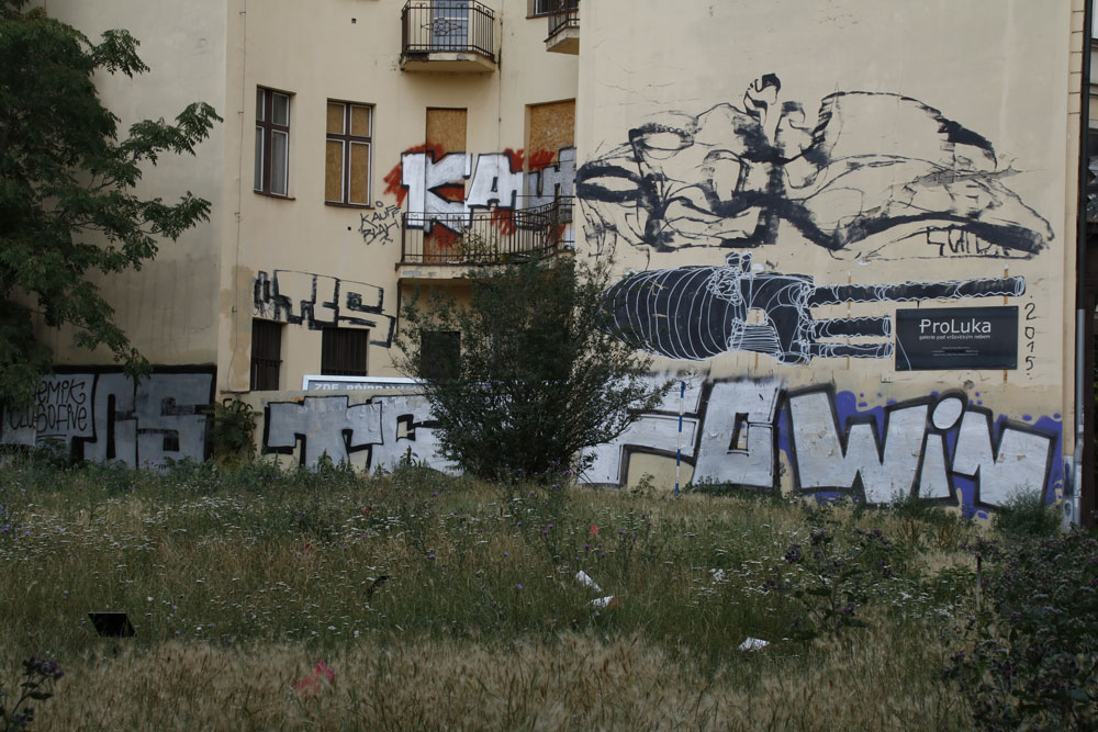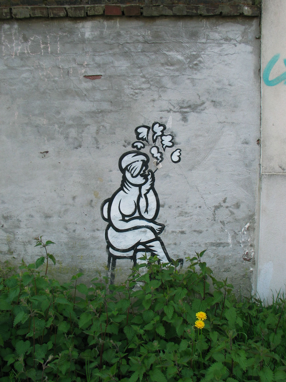 Streetart in Mönchengladbach. Bis auf das kleine Schablonen(?)graffito wird aber sicher in näherer Zukunft alles abgerissen werden. Die Stadt verkauft gerade das Gelände, auf dem auch der Margarethengarten entstanden ist. http://waldhaus12ev.de/margarethengarten/