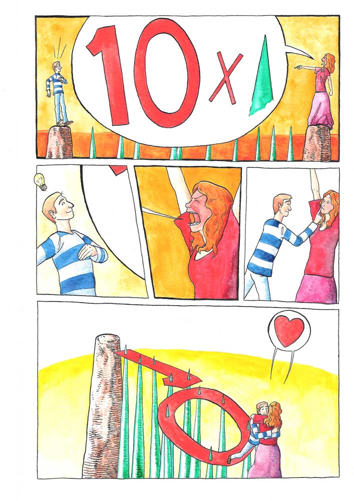 Man merkt nur, daß das ein Wettbewerbsbeitrag ist. Die Story ist eine formale Spielerei rund um die Zahl "10" - mit einer formalen Problemstellung und einer formalen Lösung, also nichts aus dem wirklichen Leben. Vielleicht gefällt das manchen Leuten gerade, aber ich würde sagen: Zeichne lieber einen Comic, der etwas mit Dir zu tun hat (muß ja nicht direkt autobiografisch sein, aber so, daß der Leser sieht, daß eine eigene Erfahrung von Dir drinsteckt).