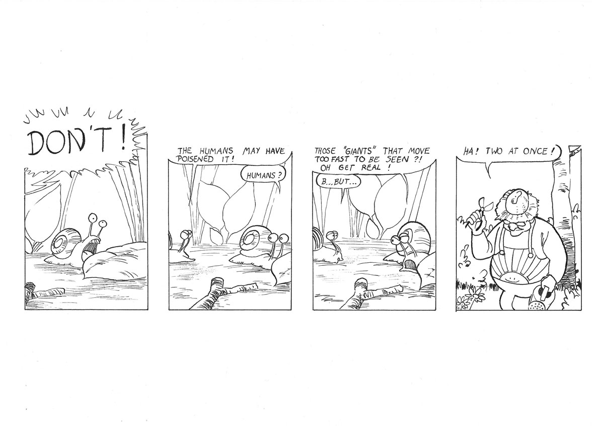 Die Figuren sind echt witzig gezeichnet, besonders die eben zubeissen wollende Schnecke im ersten Bild. Die haben auf jeden fall Potential! Die Pointe wird leider nicht ganz deutlich.