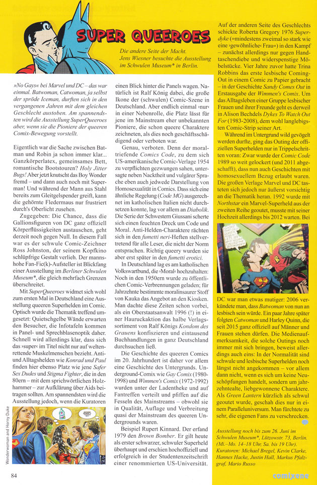Das amerikanische Magazin "The Advocate" hat mit Justin Hall, einem der Kuratoren der Berliner Ausstellung ein lesenswertes Interview zu "SuperQueeroes" geführt: http://www.advocate.com/arts-entertainme…r-superqueeroes