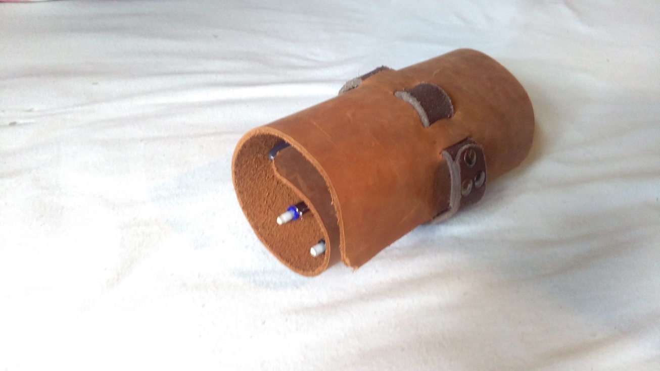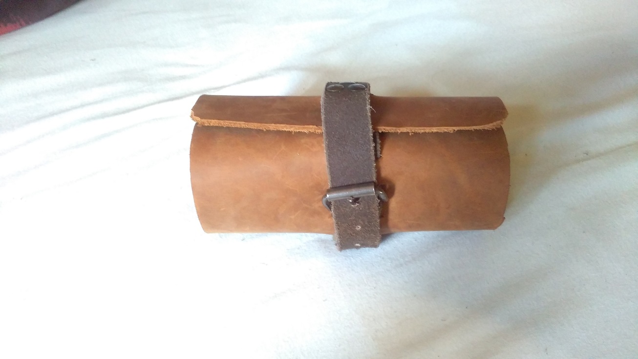 Gemacht aus einem Stück Spaltleder und einem alten Gürtel, obwohl ich im nachhinein betrachtet villeicht etwas leichteres Leder hätte nehmen sollen.