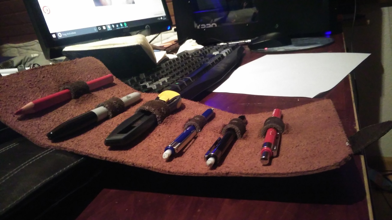 Vorallem wars billiger als wenn man sowas kaufen müsste. 7€ im Möbellbezugs-/Stoffladen für n großes Stück Spaltleder. Da könnt ich locker noch 2 von den Dingern rausholen. Und dann entweder vom gleichen Stück nen Riemen schneiden, oder wie ich nen weicheren LederGürtel benutzen.