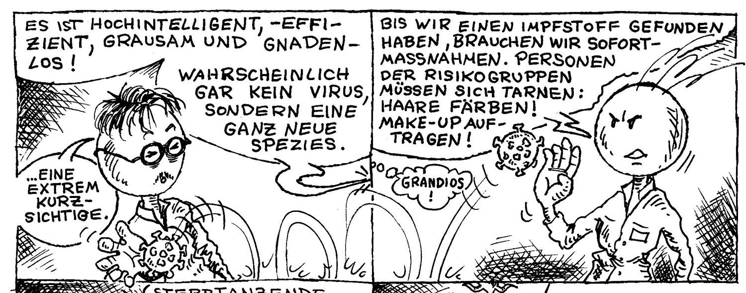 Mir ist eingefallen, dass ich ein passendes Beispiel für diesen Thread selbst schon mal produziert habe. In "Rescue-Man vs. Covid" habe ich dieses zwischen Dr. Knax und Dr. Satokita hin und her hüpfende Virus-Modell gezeichnet. Scheinbar eine Bewegung, aber ein unmögliches Phänomen.