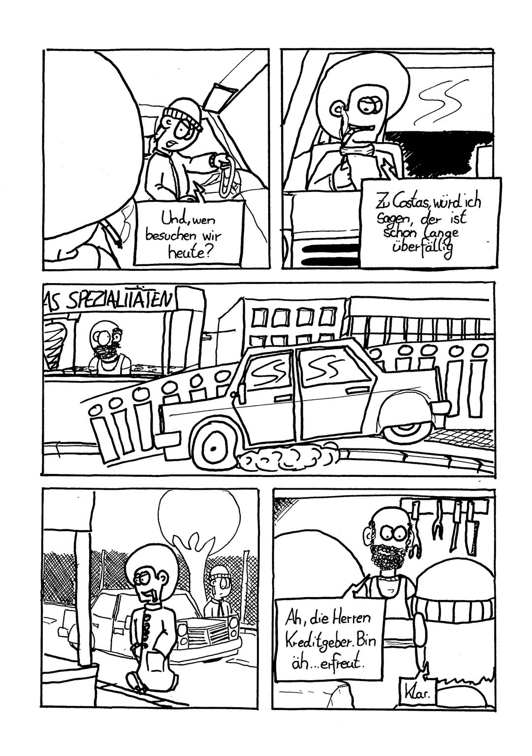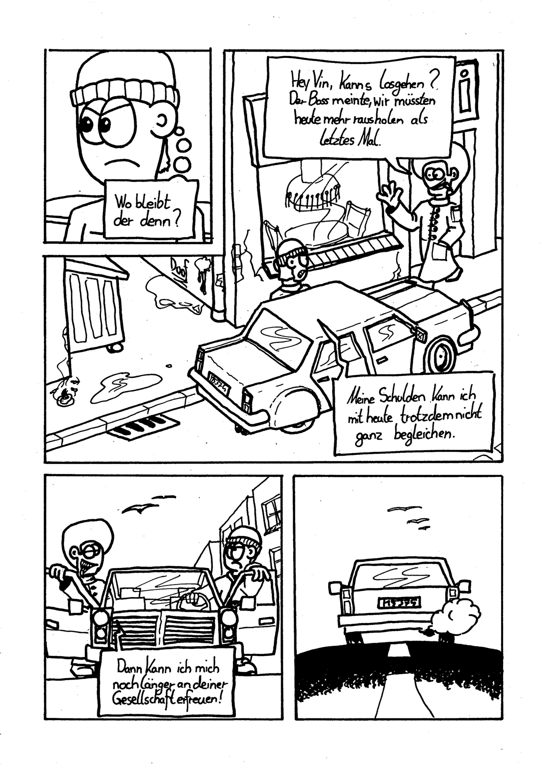 In den letzten beiden Panels auf Seite 5 sind dir plötzlich die Hintergründe abhanden gekommen. Ansonsten hat die Geschichte "Suspence", das heißt sie ist so erzählt, daß man sich immer fragt wie es denn jetzt weitergeht.