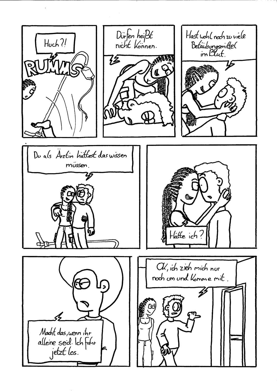Man kann sich zwar denken, das der Typ wegen der Wunde bewustlos wird, den noch find ich den Übergang zu den Schwarzen Panels etwas unpassend.