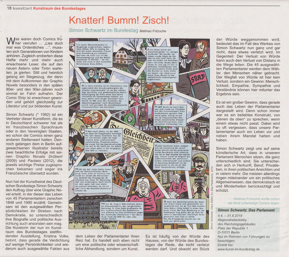 kunst:art, die kostenlose Zeitung für Kunst und Kultur, berichtet über eine Ausstellung zum Comic "Das Parlament" von Simon Schwartz im deutschen Bundestag und fühlt sich bemüßigt anzumerken: "Was waren doch Comics früher verrufen (…) Der Comic Strip ist erwachsen geworden und gehört gleichzeitig zur Literatur und zur bildenden Kunst." Hach, gut dass uns das mal einer sagt. :)